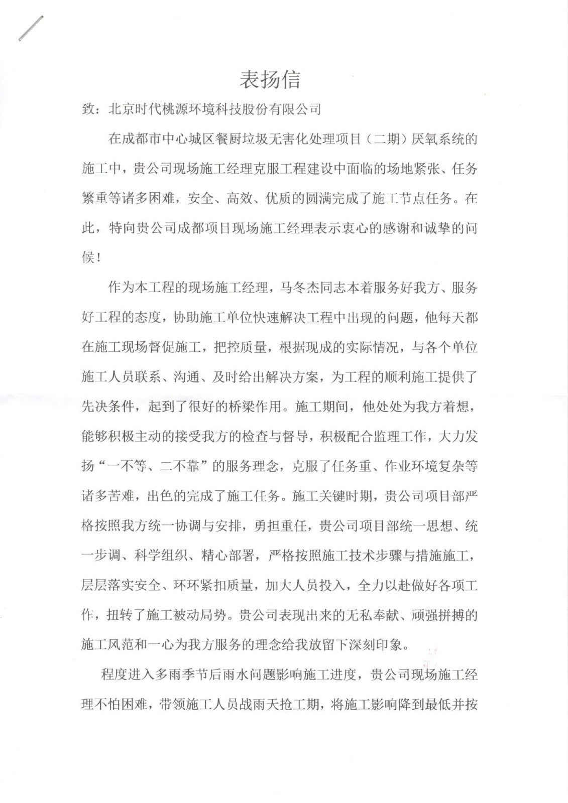 成都餐廚垃圾處理廠對時(shí)代桃源的表揚(yáng)信