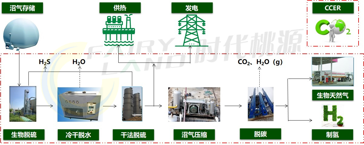 沼氣凈化與利用系統(tǒng)包括沼氣存儲系統(tǒng)、沼氣脫硫系統(tǒng)、沼氣發(fā)電凈化系統(tǒng)、沼氣發(fā)電及鍋爐系統(tǒng)、沼氣提純制天然氣系統(tǒng)和沼氣提純制氫系統(tǒng)。